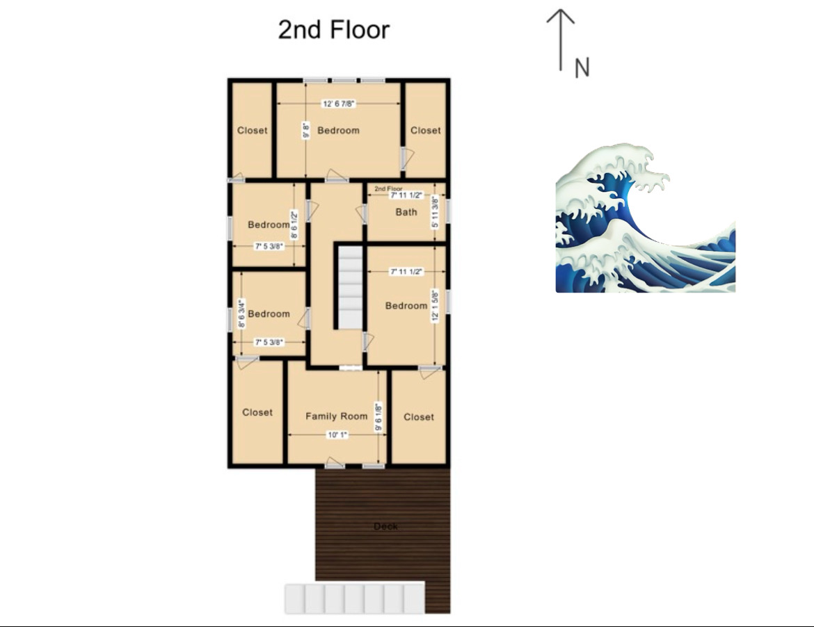 Our beach house features 3 bedrooms and 2 full baths on the 1st floor as well as 4 bedrooms and 1 full bath on the 2nd floor. Great for extended families. Outdoor space is fully fenced in with seating on upper deck and lower patio.